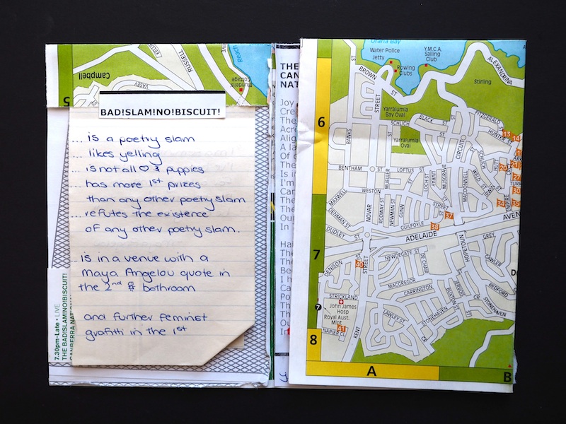 BAD!SLAM!NO!BISCUIT! … is a poetry slam … likes yelling … is not all [love] & puppies … has more 1st prizes than any other poetry slam … refutes the existence of any other poetry slam … is in a venue with a Maya Angelou quote in the 2nd [drawing of skirted stick figure] bathroom and further feminist graffiti in the 1st