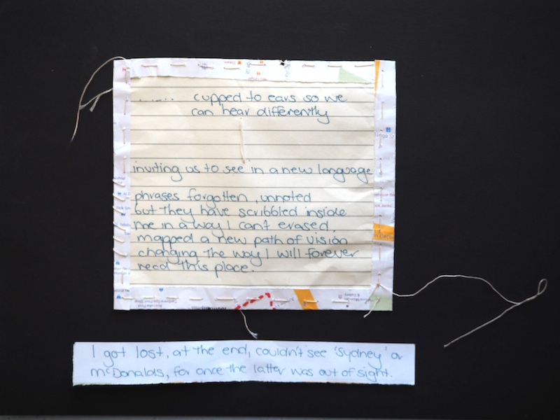 … cupped to ears so we can hear differently inviting us to see in a new language phrases forgotten, unnoted but they have scribbled inside me in a way I can’t erase, mapped a new path of vision changing the way I will forever read this place. I got lost, at the end, couldn’t see ‘Sydney’ or McDonalds, for once the latter was out of sight.
