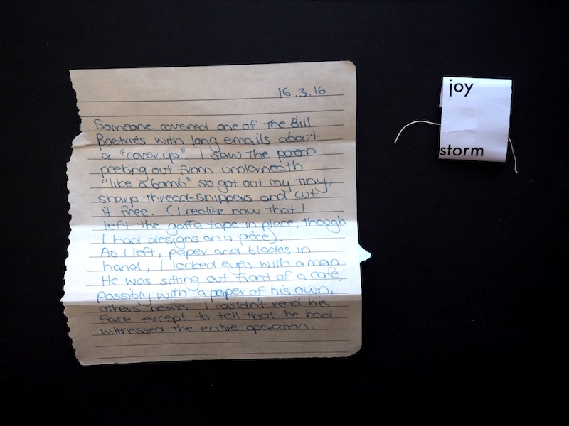 16.3.16 Someone covered one of the Bill Poetries with long emails about a “cover up”. I saw the poem peeking out from underneath “like a bomb” so got out my tiny, sharp thread-snippers and cut it free. (I realise now that I left the gaffa tape in place, though I had designs on a piece). As I left, paper and blades in hand, I locked eyes with a man. He was sitting out front of a cafe, possibly with a paper of his own, others’ news. I couldn’t read his face except to tell that he had witnessed the entire operation.