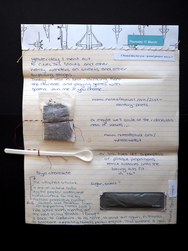 Yesterday I went out to Cities Tell Stories and other wordy wonders on streets and other surprising stages. Today I rest in bed, drinking from the daintree and playing games with spoons. Join me if you choose … http://www.notedfestival.com/21st-century-poets or maybe smile at the ridonculousness of words … http://www.notedfestival.com/whooziwotsit or link lives like superstars of plague proportions, remix histories until the boring bits fit in Im2. Byo chocolate. Sugar sweet? p.s. The attached artwork (a one-of-a-kind haiku digital poster written and handcrafted for me by festival producers Duncan Felton and Andrew Galan for supporting Noted 2015) has spent many months on the wall in my studio. I brought it back to Canberra, to its home, to send to someone supporting Noted’s postal project. That someone is you. Thank you.