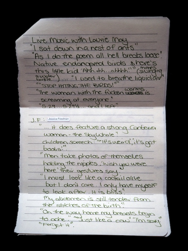 Live Music with Laurie May. I sat down in a nest of ants. As I do the poem all hell breaks loose. Native endangered birds & here’s this little kid “Ahh.ahh…ahhhh!” (mimes swinging a water bottle) … “I used to breathe liquid air” “STOP HITTING THE BIRDS!” The woman with the fucken worms is screaming at everyone. 5.29… 5.29 1/2 … and I left. Jessica Friedman (J.F.): … it does feature a strong Canberra woman – the SkyWhale. Children screech: “It’s weird”, “it’s got boobs!”. Men take photos of themselves holding the nipples. ‘Wish you were here’ their gestures say. I must look like a cocktail olive but I don’t care. I only have myself to look after. It is bliss. My abdomen is still tender from the stitches of the birth. On the way home my breasts begin to ache. “Just like a cow.” “I’m sorry.” “Forget it.”