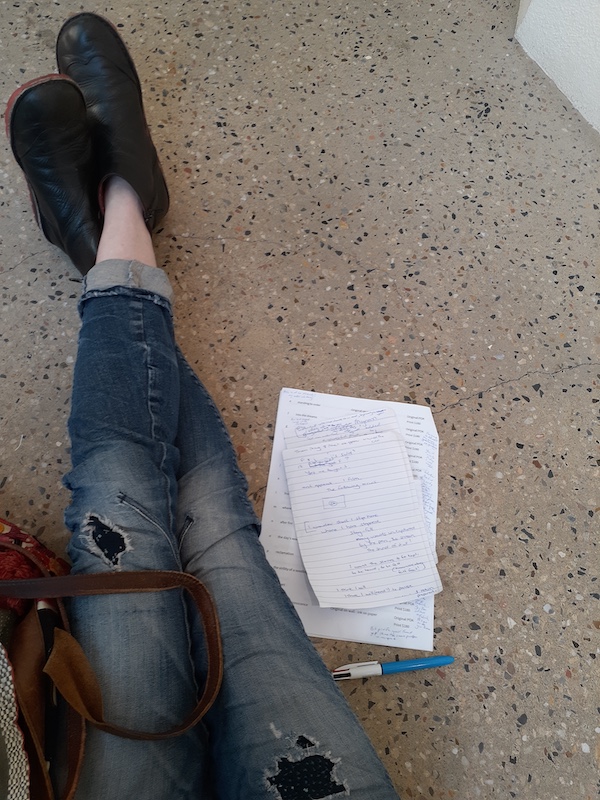 image: indigo’s denim legs extended out on a terrazzo floor. Cosy-close on her left, her bag drapes a leather handle over her leg. To the right, a pile of handwritten papers and resting under them, a four-colour pen.