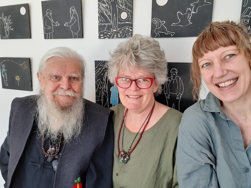 photo: Ervin, Belinda and indigo, in front of Ervin Janek’s woodblock prints, taken by another kindly stranger – thankings!