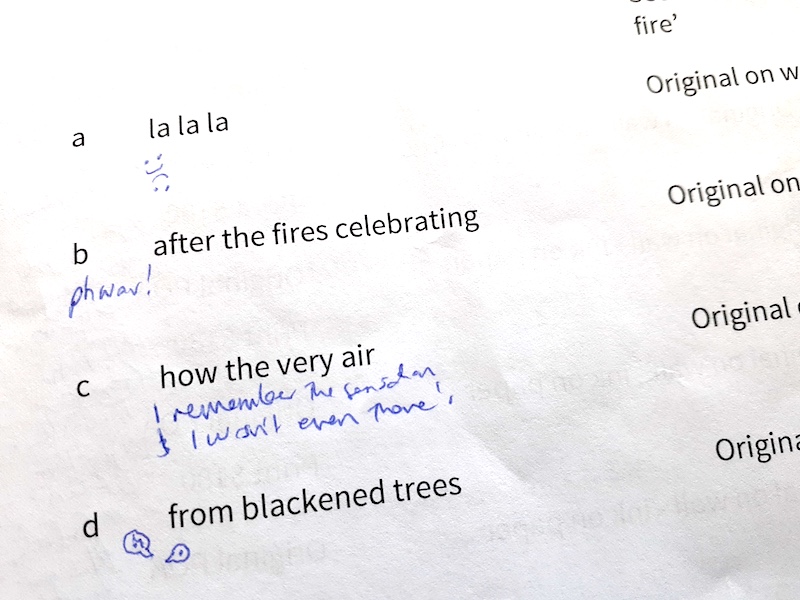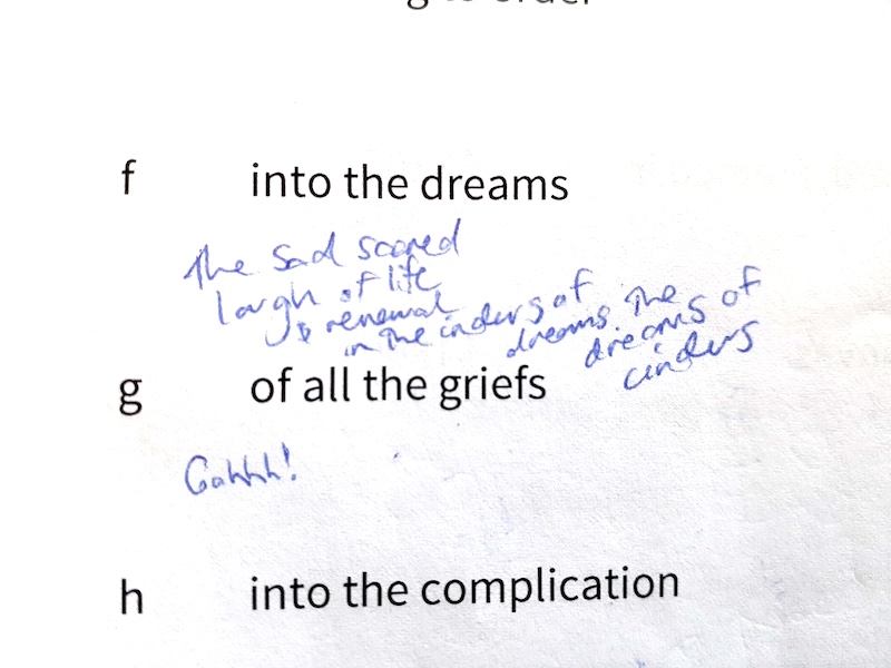 I draw a candle with the word ‘hope’ in the middle – a poem of my own ‘relates to their poetic prompt’, I scribble. It’s an old poem I’ve maybe under-rated, think I might like to read again. ‘the universe in a grain of sand’ and all that perceptual jazz. Near to the candle, I jot down ‘blog post?’ The connection/s have the cogs turning, an early seed is sown.